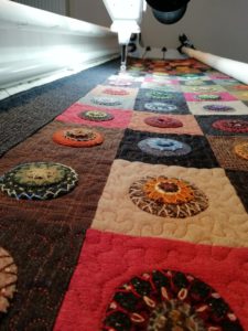 Je ne veux pas écraser son superbe travail de broderie, je décide donc de quilter le tour de chaque pennies histoire de les faire ressortir… et d’ajouter un petit vermicelle entre chaque broderie.