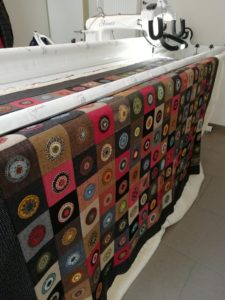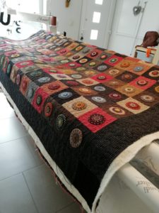 Réalisé avec des lainages (tissus récupérés de costumes d’homme, de vestes, tailleurs de femme mais aussi de tissus achétés, échangés à droite et à gauche dans le plus pure esprit du patchwork)… Il est superbe ! et elle me le confie pour le quilting. Le défis est grand… le stress monte mais elle a confiance donc je fonce…