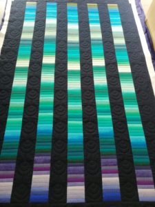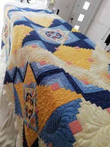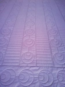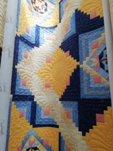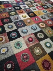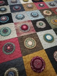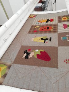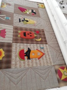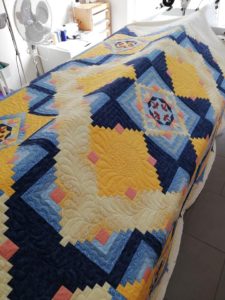 Cette semaine j’ai repris un ancien bloc du mois de chez Buttermilk qui attendait son quilting depuis bien trop longtemps. Il est installé sur la machine et les premiers blocs sont quiltés.