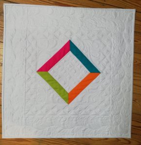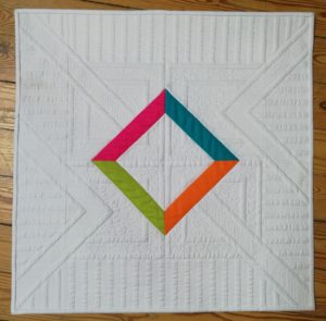 J’ai également terminé le mini quilt réalisé lors d’une animation d’atelier par Martine Chapuis. Il ne restait plus grand chose à faire. Micro-quilting et bandes de finitions, mais il fallait le faire…
